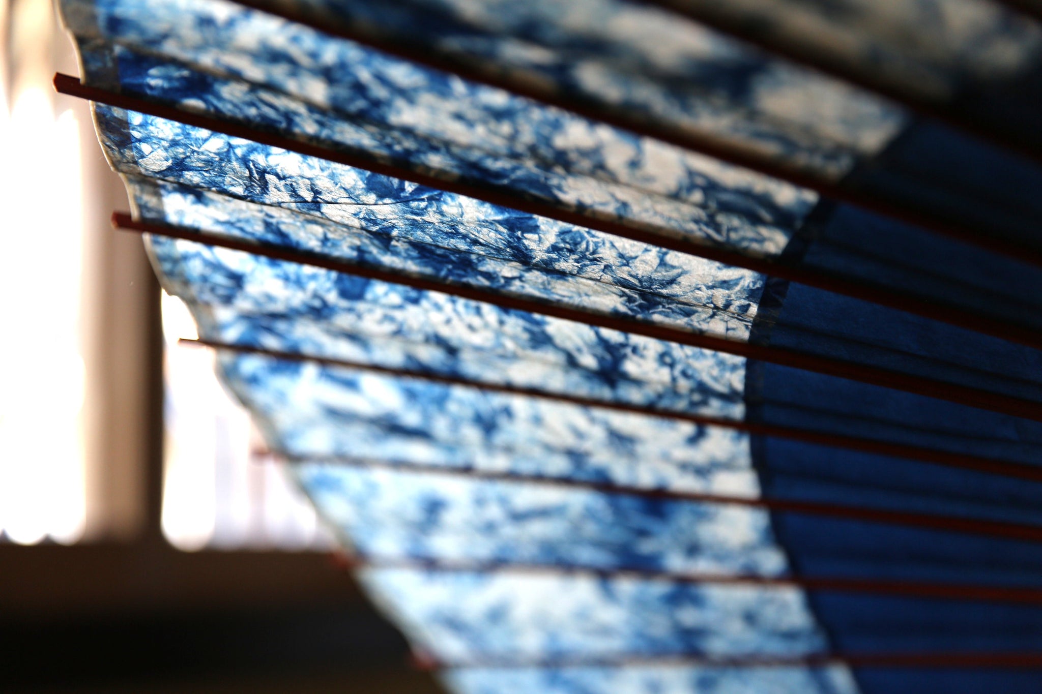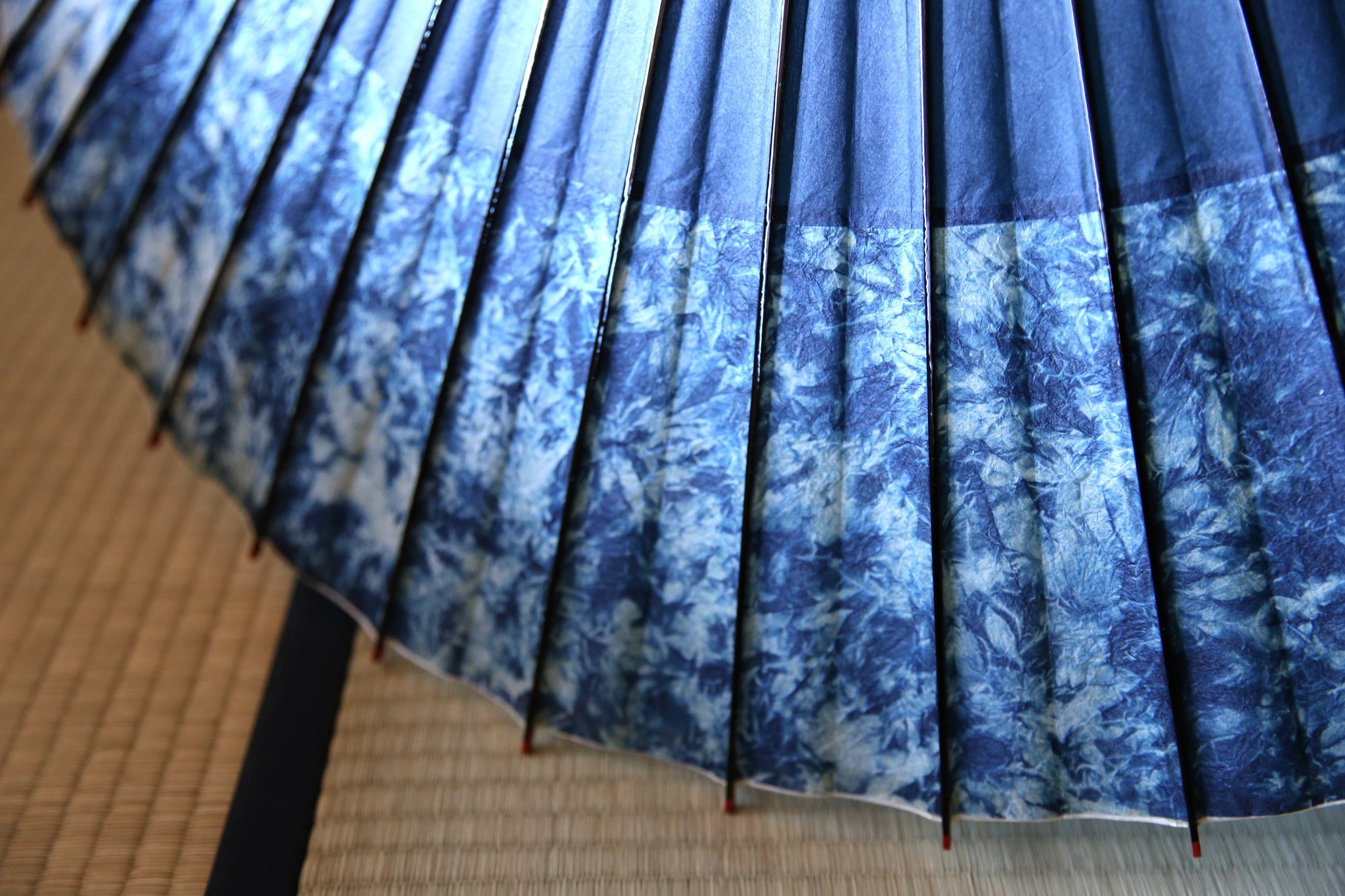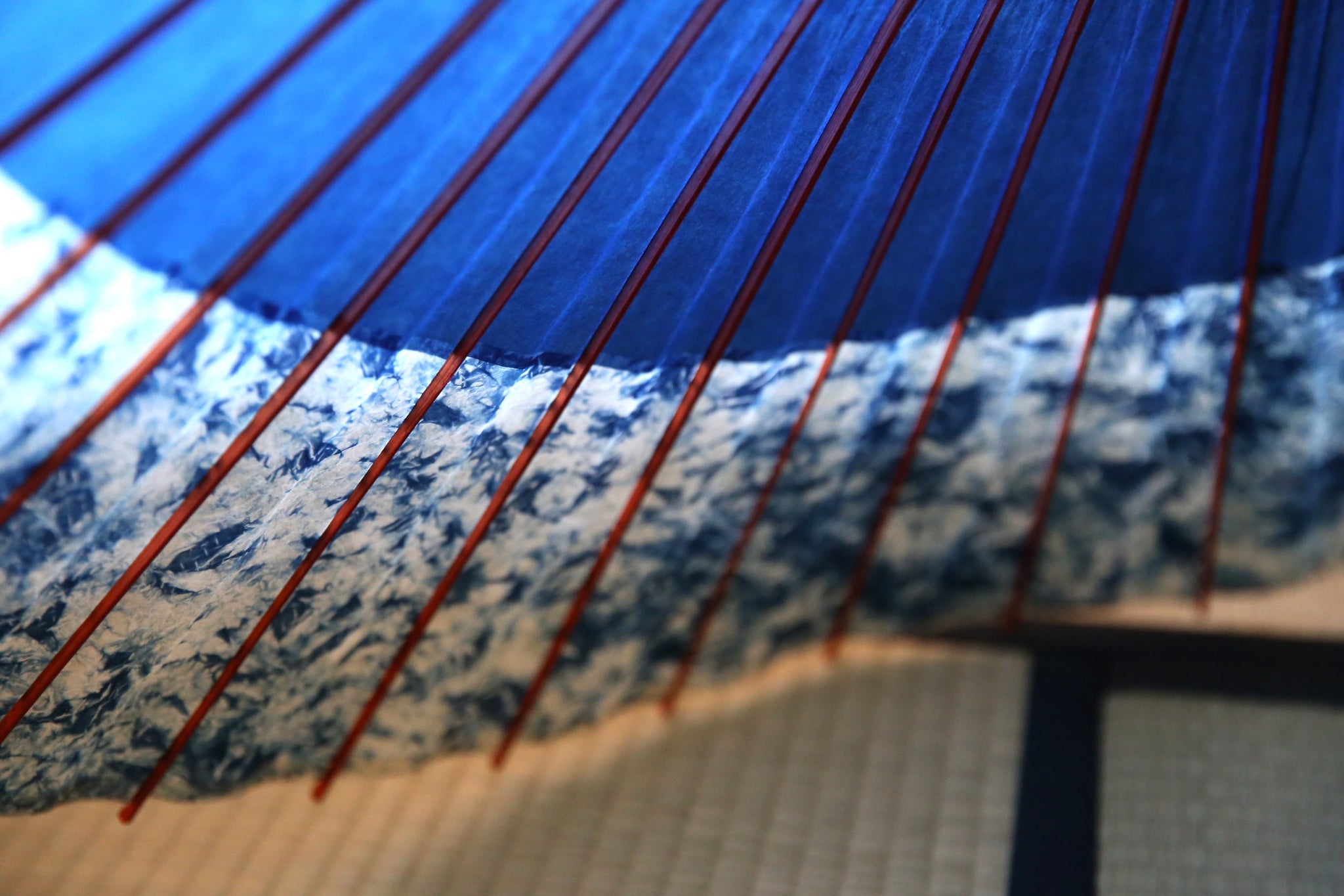 渡辺染物店ならではの濃い藍染の和紙は、油を引いて透けてこそまた見える透明感が息をのむ美しさ。
