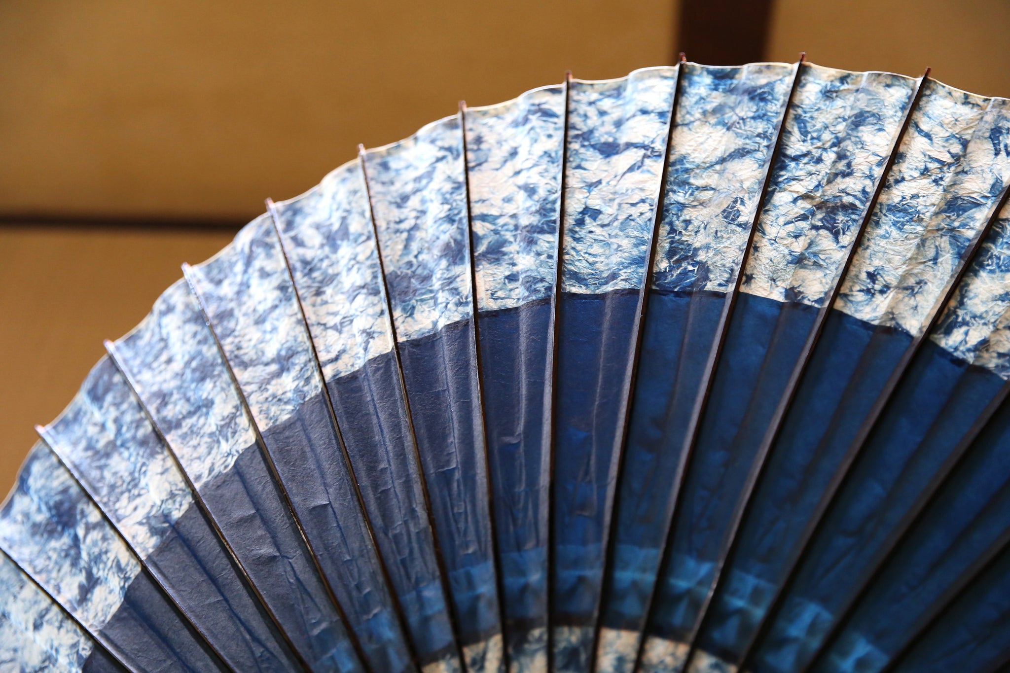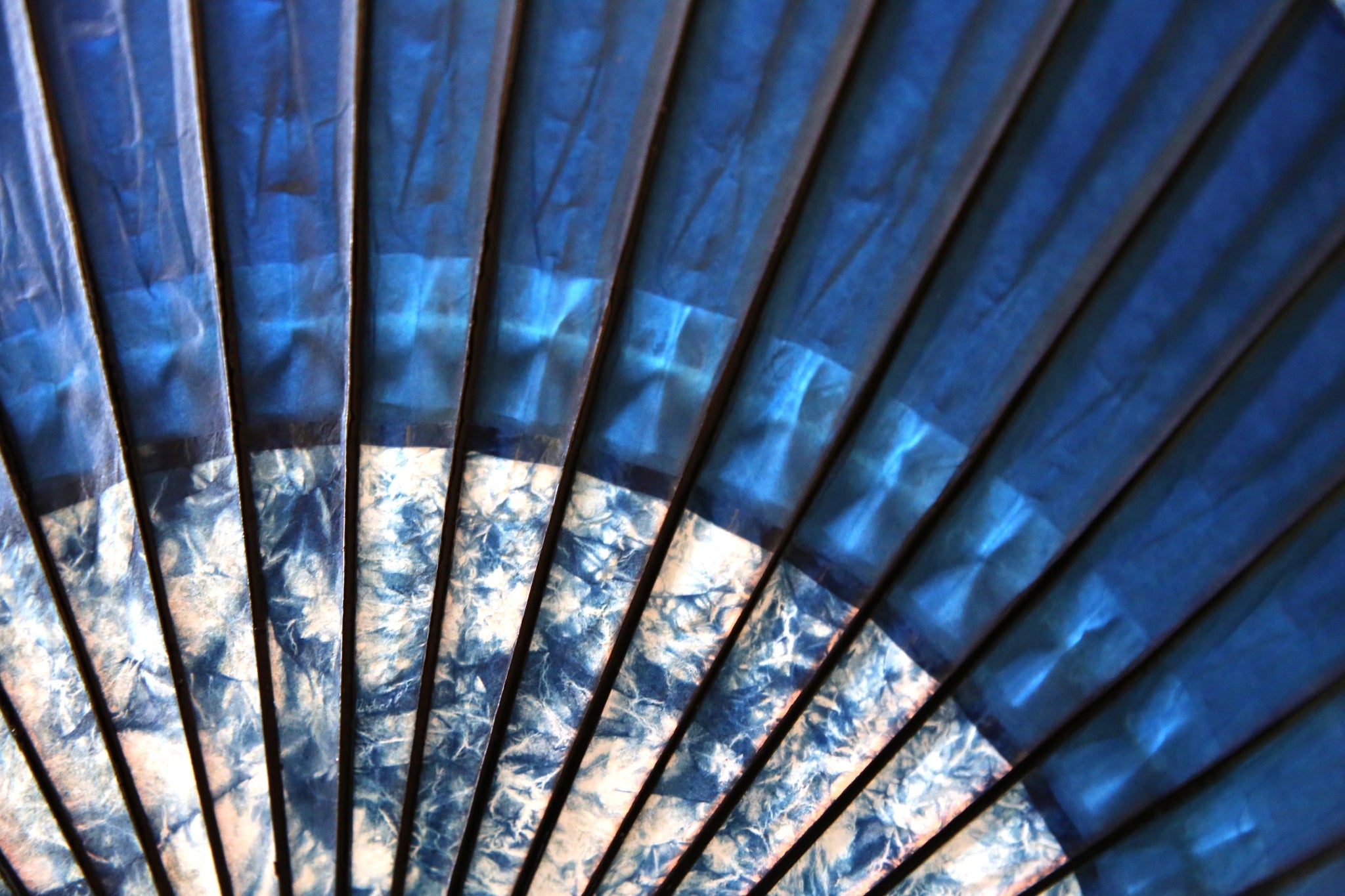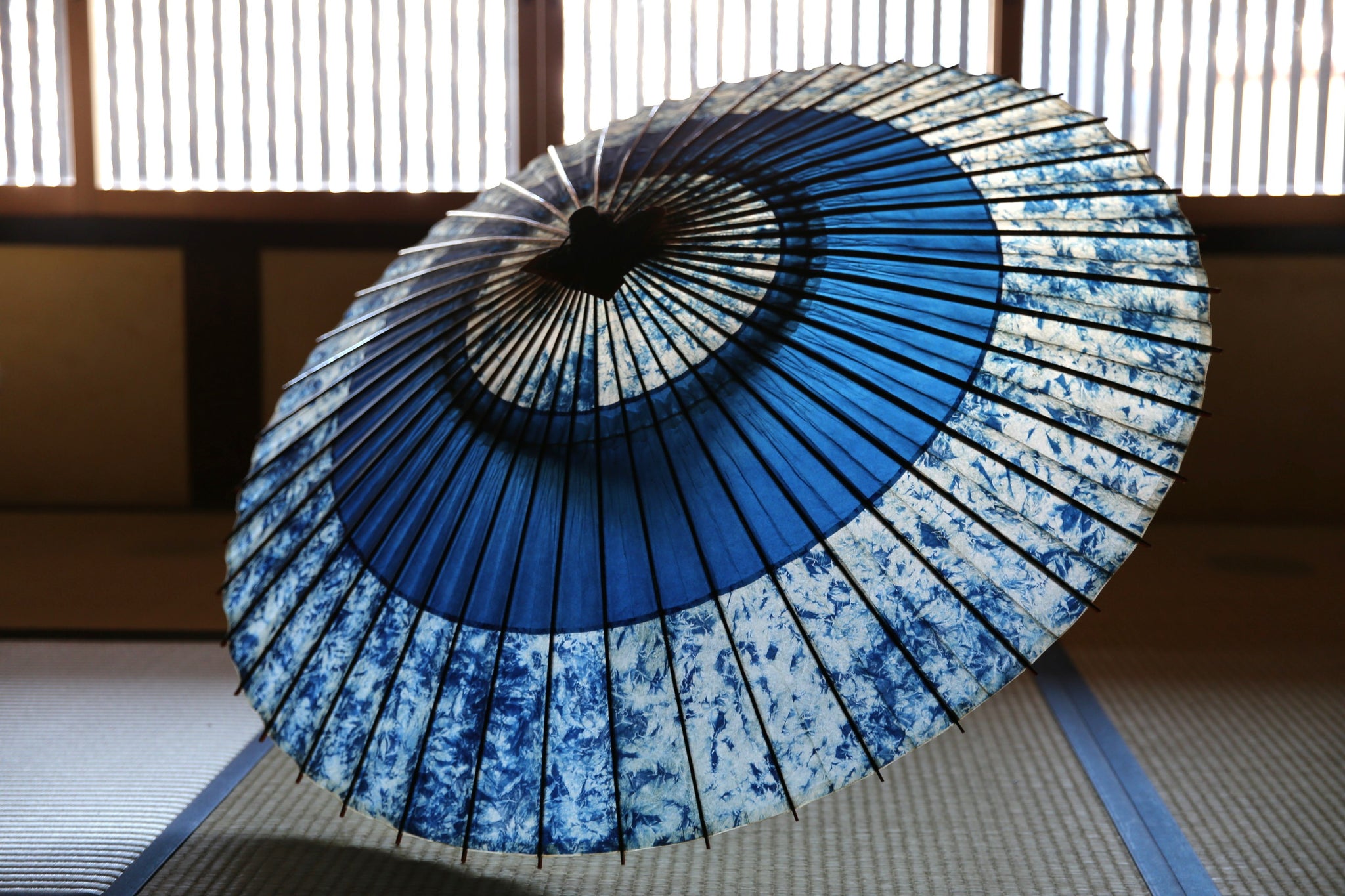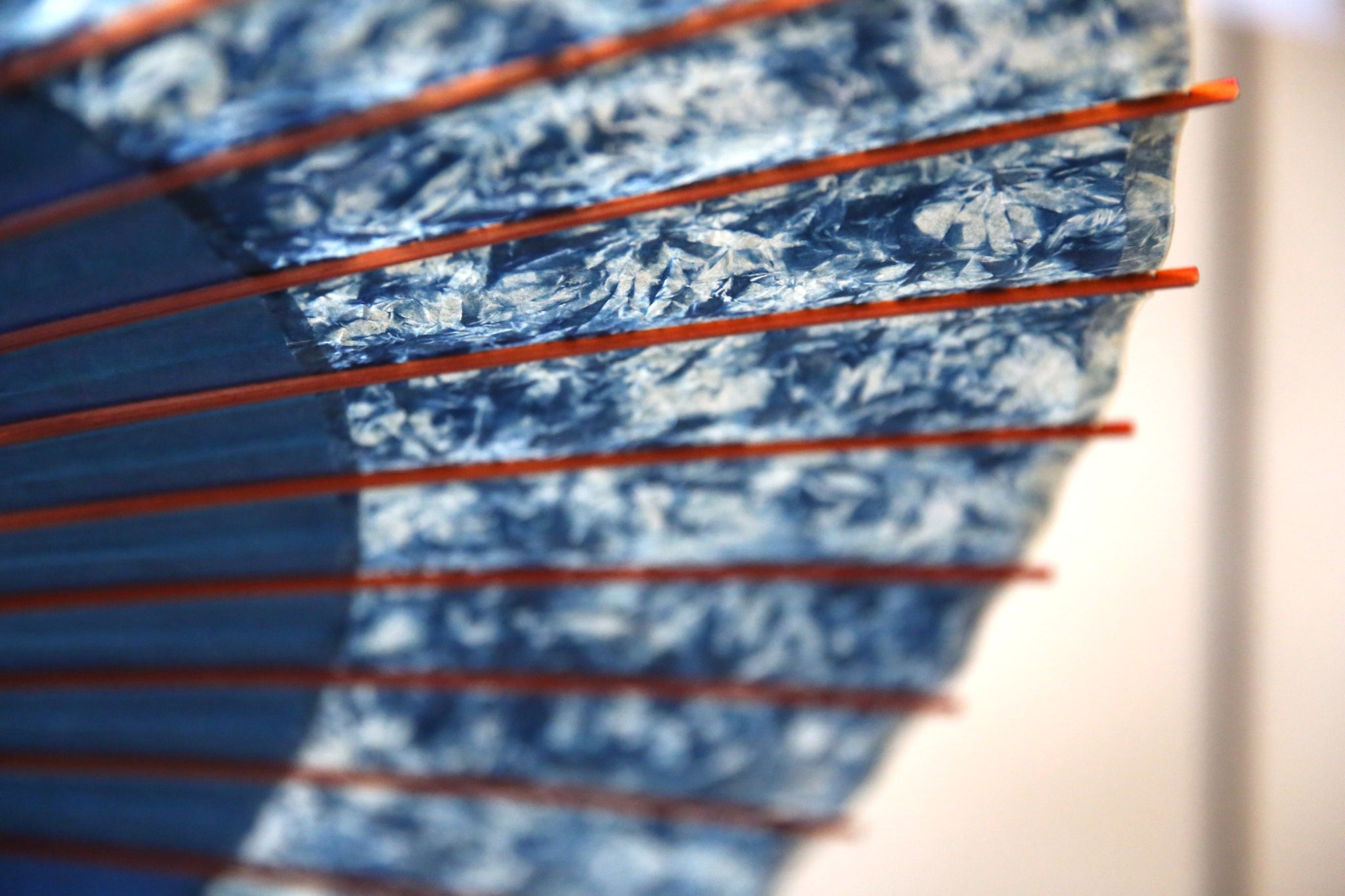 渡辺染物店ならではの濃い藍染の和紙は、油を引いて透けてこそまた見える透明感が息をのむ美しさ。