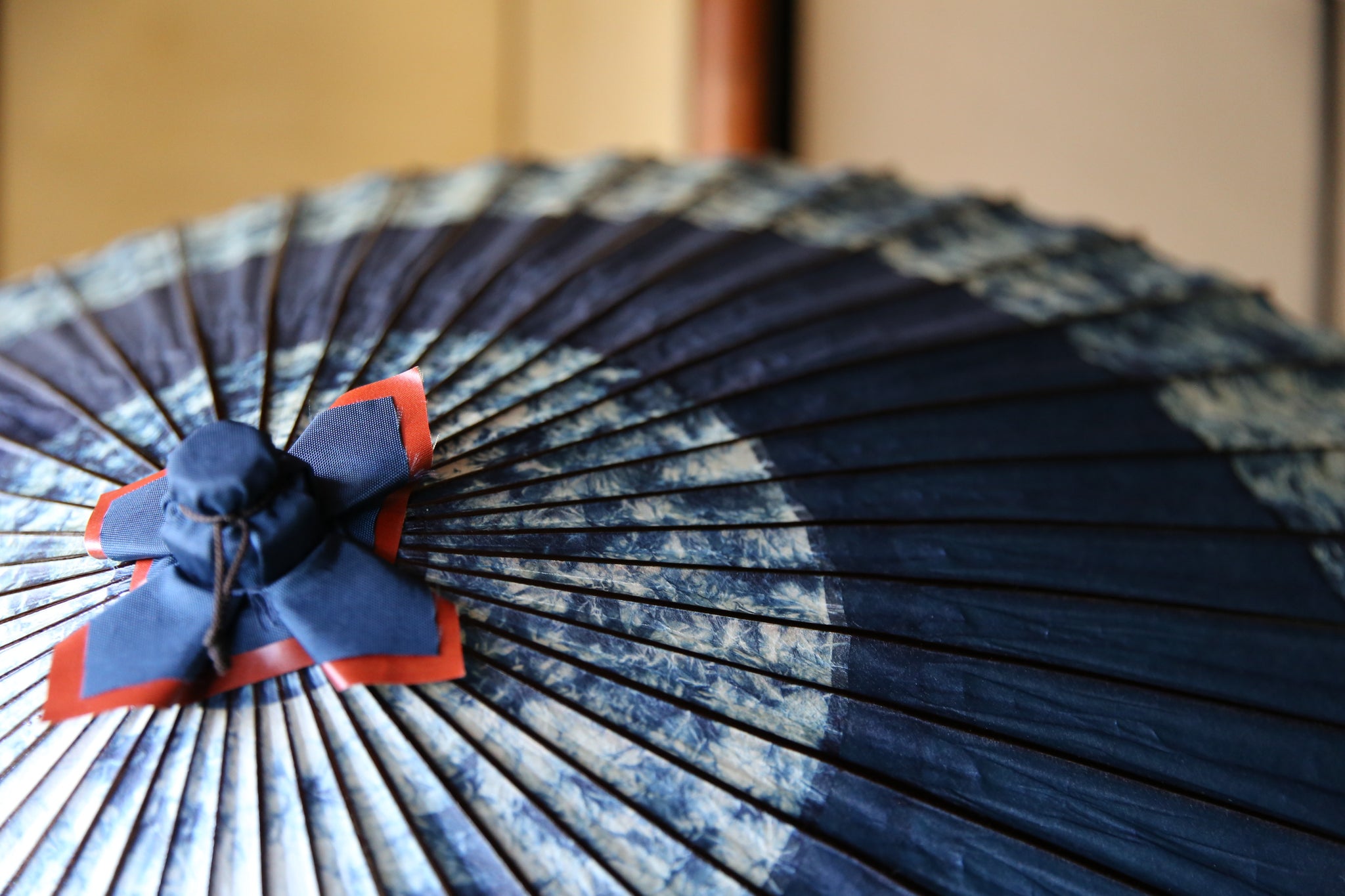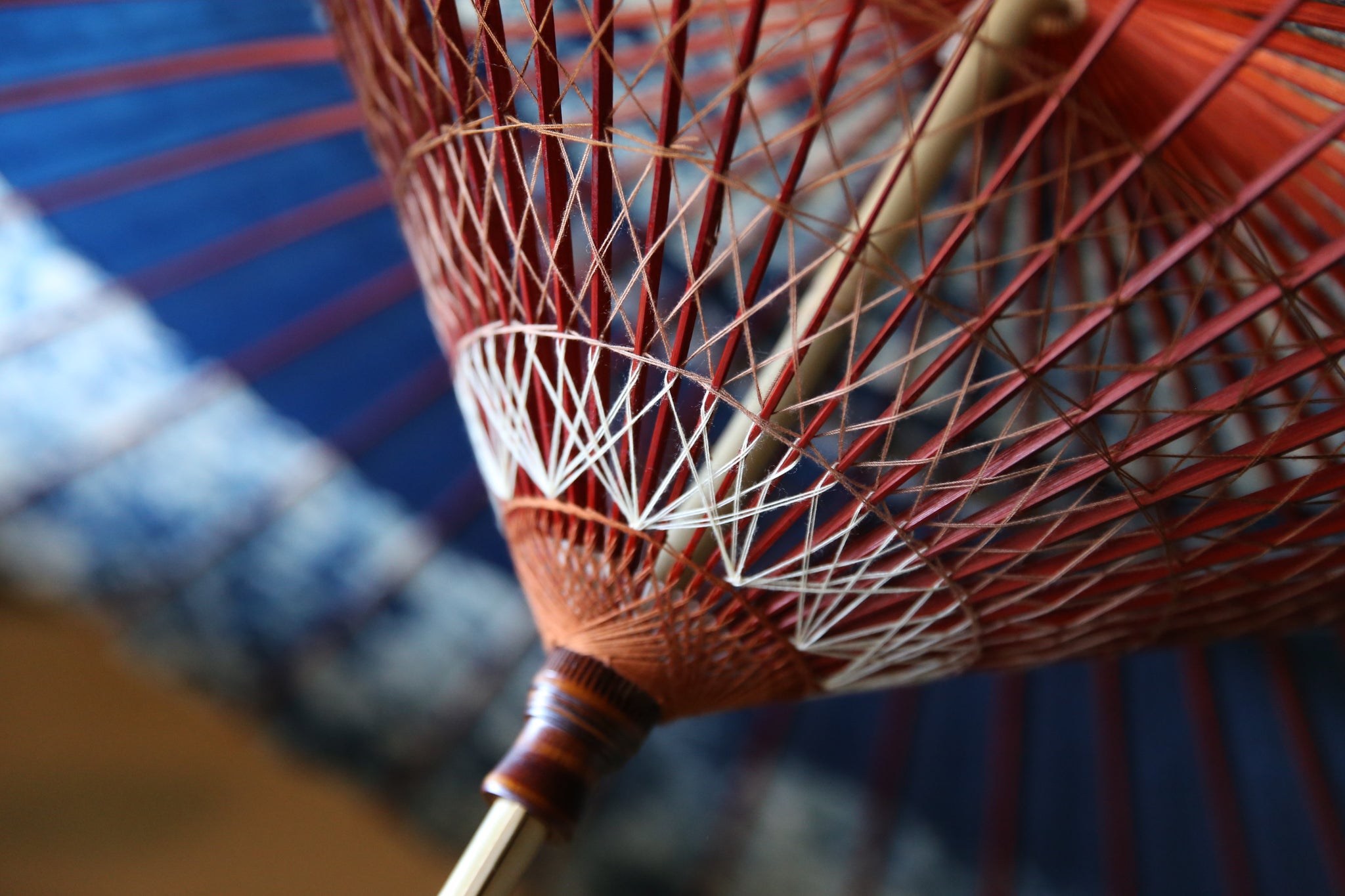 赤く染められた竹骨と藍色とのコントラストが粋でかっこいい。