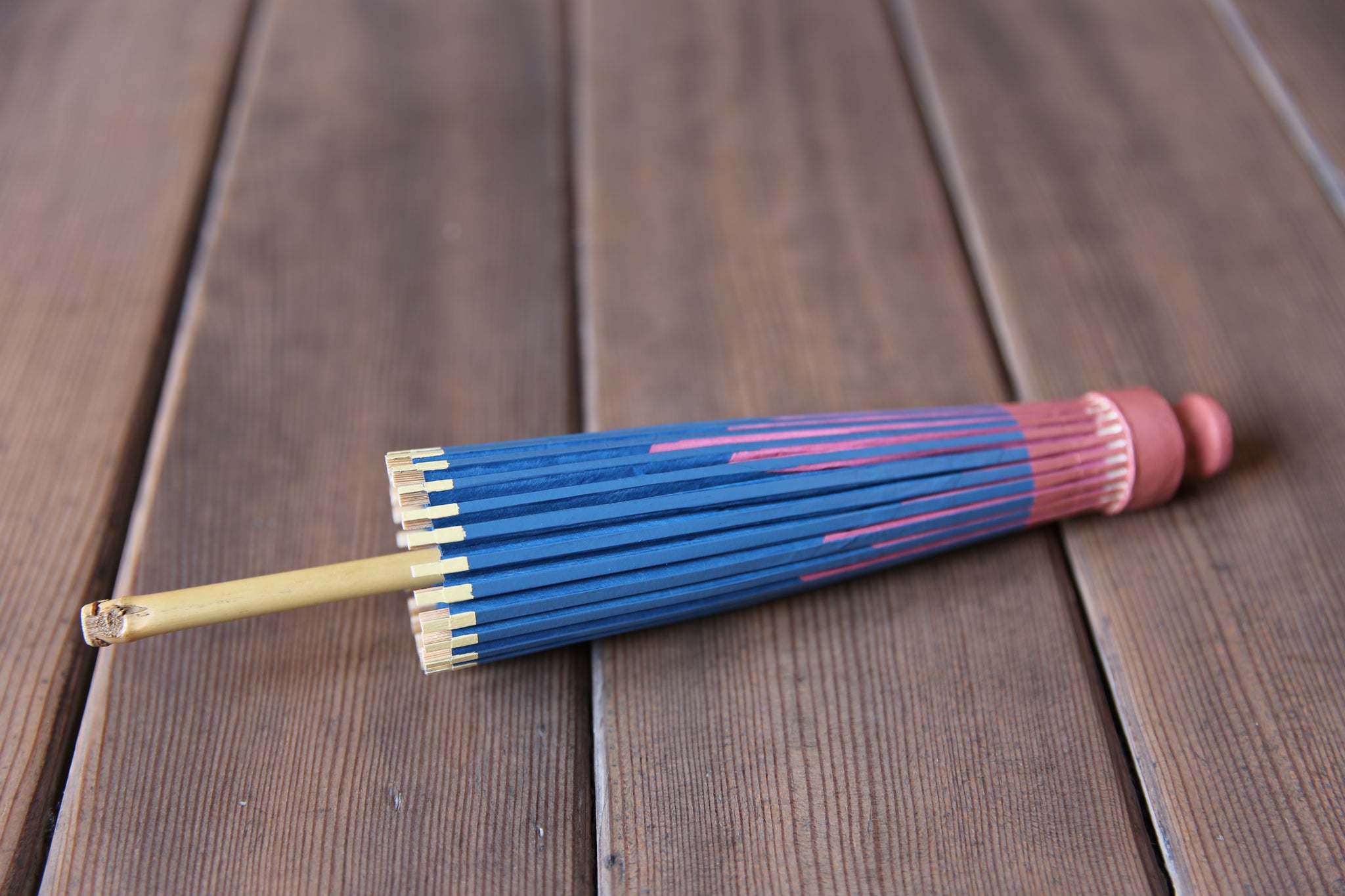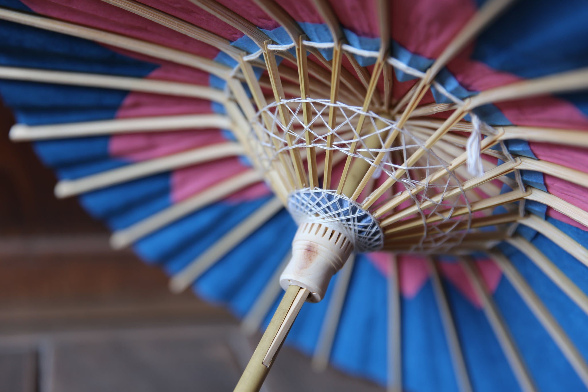 The framework of a Japanese umbrella is made from a piece of bamboo that is split evenly and assembled so that when the umbrella is folded, it returns to its original shape.